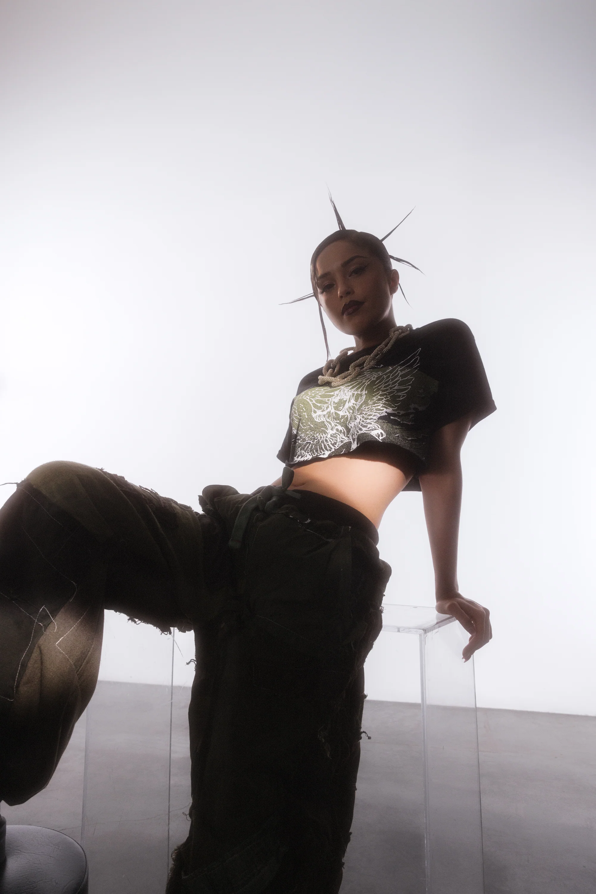 Please note: The black tee shown in the lifestyle image was cropped specifically for the photoshoot. The product you will receive is a standard fit t-shirt (not cropped).